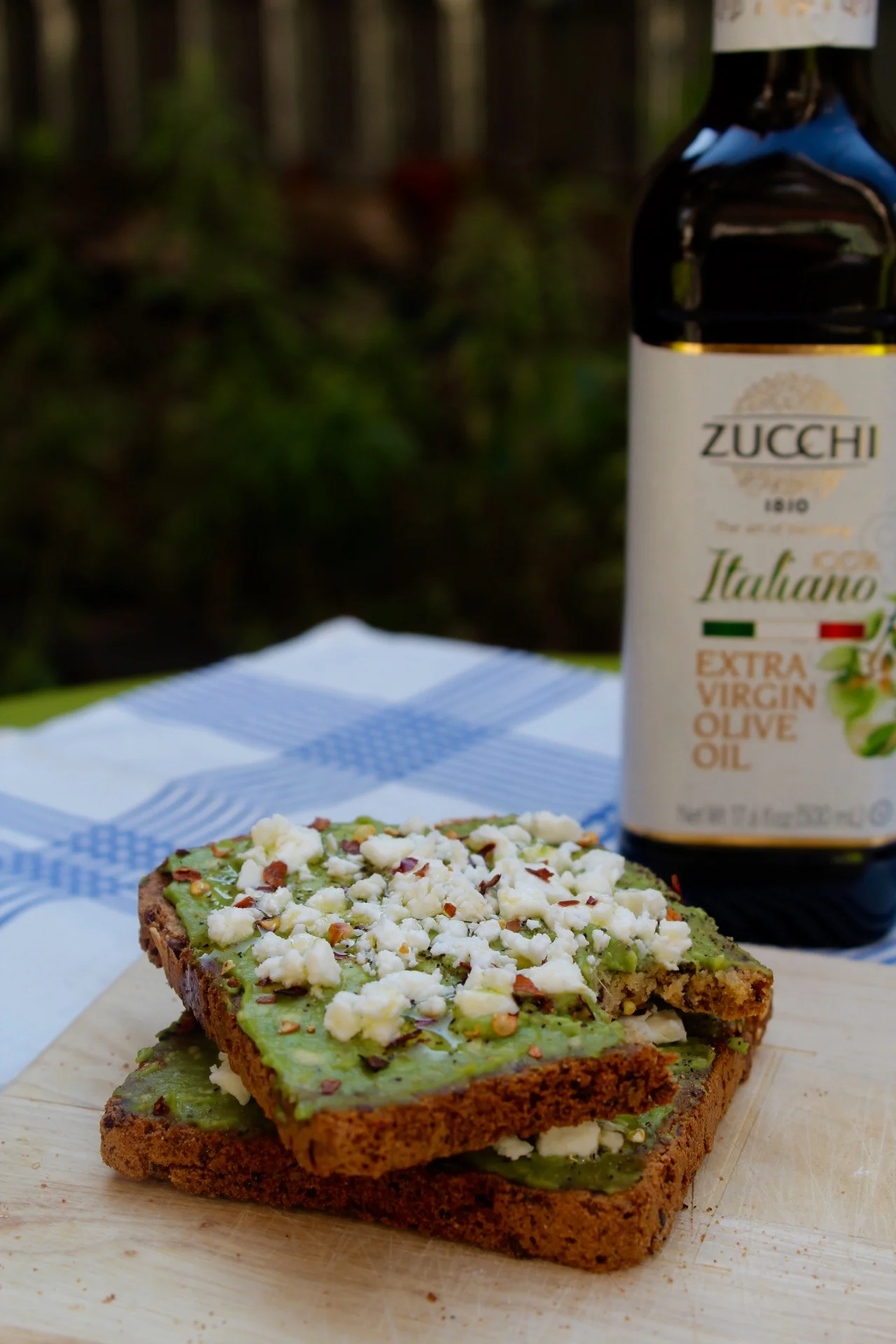 3) Dice or crumble the feta and sprinkle it over the toast. Garnish with crushed red pepper flakes then drizzle Zucchi EVOO to add flavour. Enjoy!